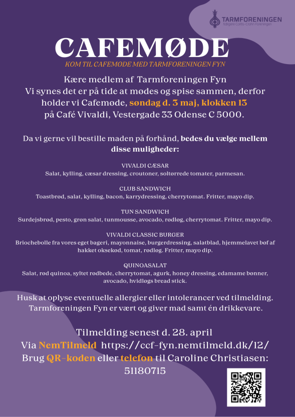 Kom og vær med til en hyggelig og uformel stund i godt selskab, når Tarmforeningen-Fyn byder velkommen til cafémøde. D. 3 maj, klokken 13.